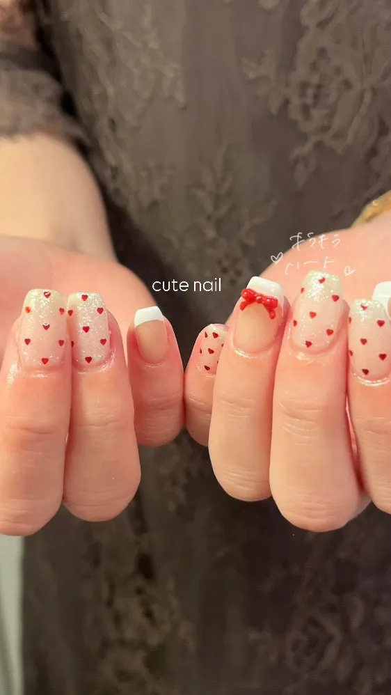 ちびはーと×フレンチリボン🎀💝#ちびはーと#ハートネイル#ハートドットネイル#ドットネイル#フレンチネイル#リボンネイル#ネイル#ネイルデザイン#東京#錦糸町